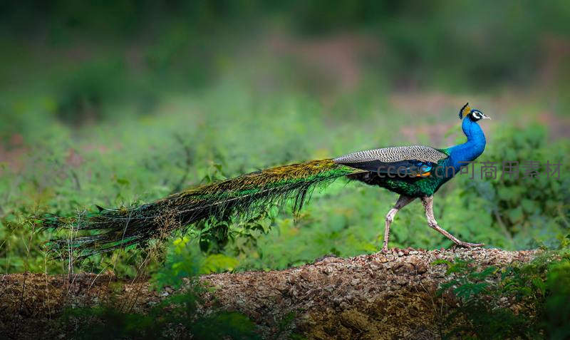 蓝孔雀迈着稳健的步伐行走在田埂之上,长长的尾羽随着步伐轻盈摆动,背景是模糊的绿色植被,展现出其在自然栖息地中从容不迫的王者风范。