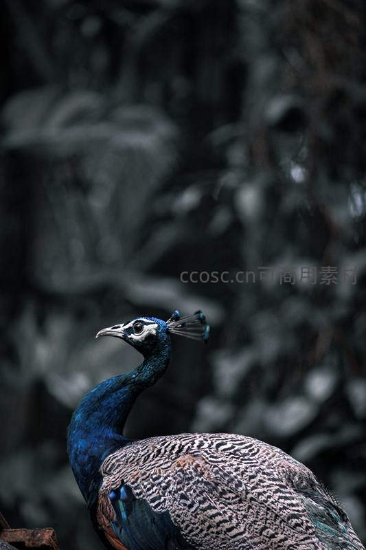 在深色模糊背景下,孔雀侧身回眸,蓝色颈部与精致头冠在暗光中格外突出,眼神专注而深邃,流露出一种孤傲而高贵的气质。