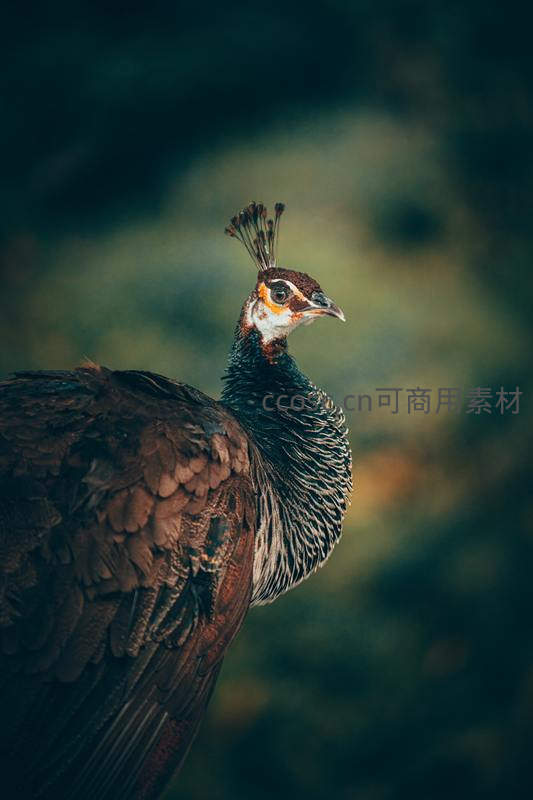 一只孔雀的侧面特写,头部羽冠高耸,眼神锐利,颈部和背部羽毛纹理清晰,在柔和光线下展现其高贵与野性之美。