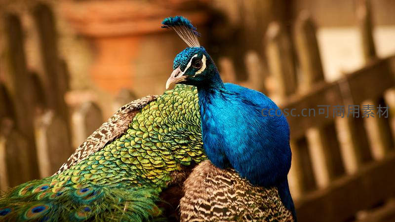 一只雄孔雀侧身回眸,目光专注,颈部宝蓝色羽毛与背部翠绿鳞片状羽翼形成鲜明对比,背景虚化突出主体,尽显华美姿态。