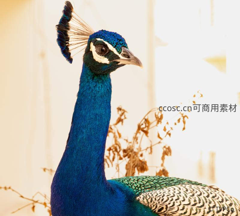 一只雄性蓝孔雀的头部与颈部特写,其头顶羽冠高耸,羽毛呈现深邃的宝蓝色,眼神锐利,背景虚化突出主体,尽显高贵气质。