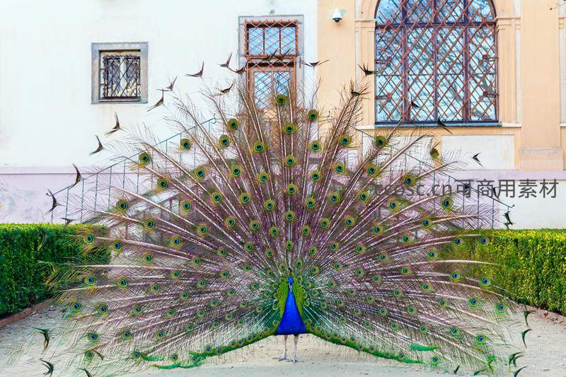 开屏孔雀惊艳庭院,尾羽如扇展华章