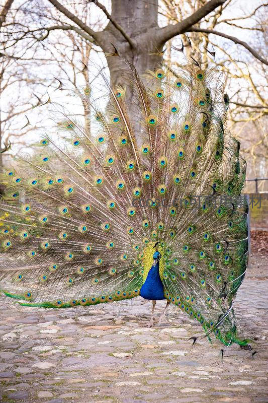 一只雄性孔雀在石板路上展开它华丽的尾羽,每根羽毛上的眼斑都闪耀着蓝绿光泽,背景是光秃的树枝,尽显自然之美。