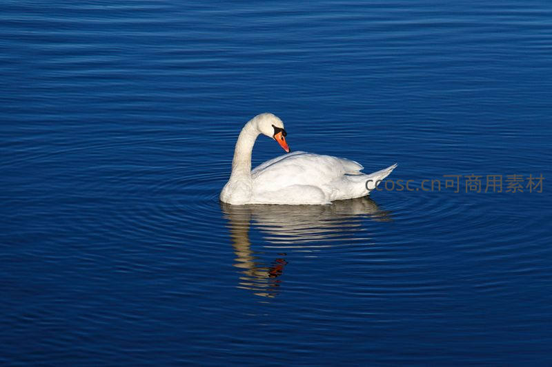 一只洁白的天鹅独自漂浮在深蓝色的平静湖面上,其优雅身姿与完美倒影构成对称美感,传达出一种远离尘嚣、内心澄澈的宁静氛围。