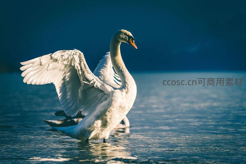 一只天鹅在清澈水面展开洁白羽翼,金色阳光洒落其身,羽毛细节清晰可见,展现出生命的力量与自然的静谧之美。