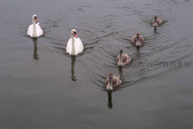 天鹅家族湖面游弋泛起涟漪