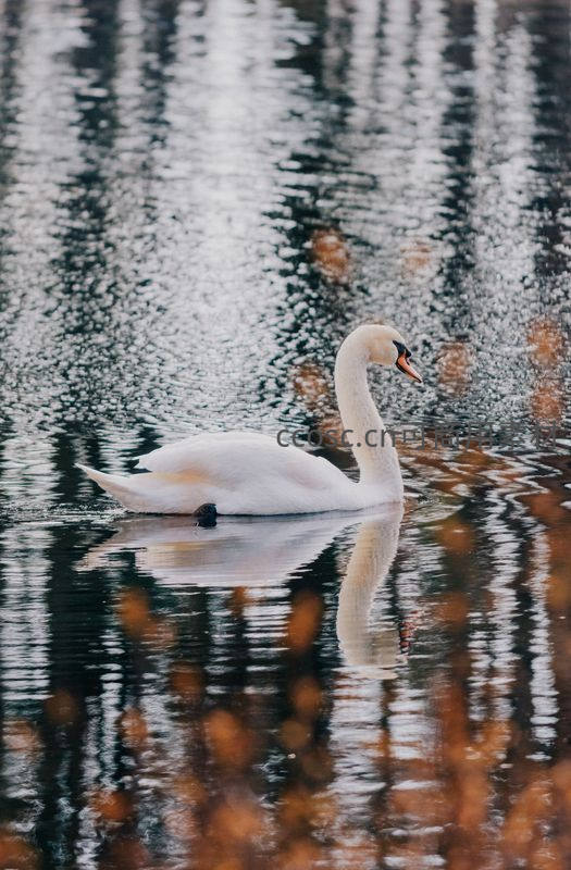 一只白天鹅在平静水面上滑行,其清晰倒影宛如镜中仙子,背景树影斑驳,营造出梦幻般的宁静氛围,令人沉醉。