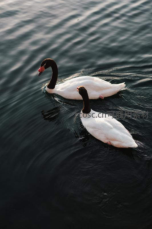 一对黑颈天鹅在波光粼粼的水面上相伴游弋,黑色的长颈与洁白的身躯形成鲜明对比,共同划出优美的涟漪,充满诗意与温情。