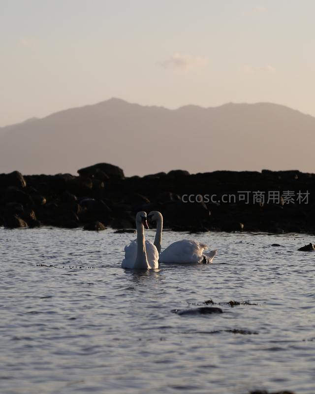 两只天鹅在暮色中于水边相依,背景是朦胧的远山和暗礁,柔和光线勾勒出它们亲密的姿态,传递出温馨与自然的和谐意境。