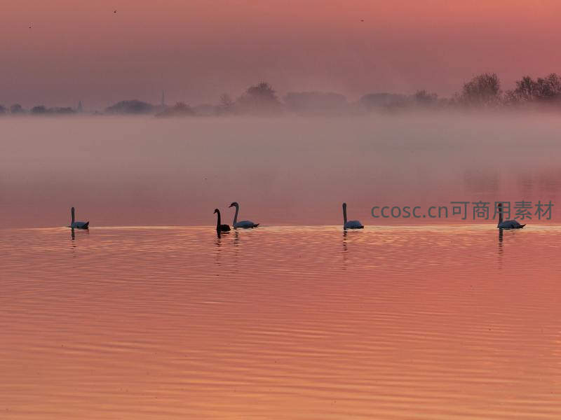 晨雾霞光中天鹅剪影