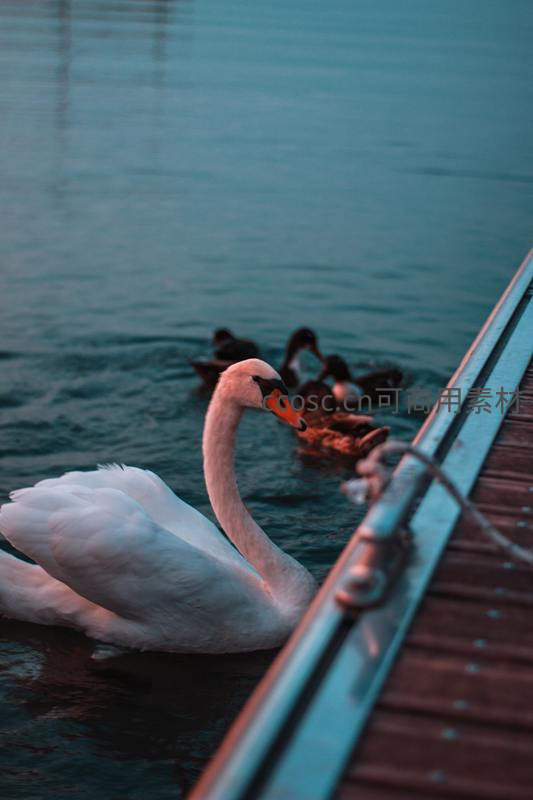 夕阳余晖下,天鹅在码头边回眸凝望,暖光洒在羽毛上,背景中鸭群模糊,水面泛着蓝紫柔光,尽显温柔宁静之感。