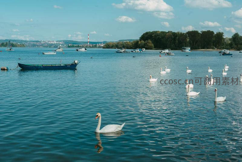 宽阔的湖面上,一群白天鹅悠闲游弋,姿态各异,水面波光粼粼,远处停泊着几艘小船,背景是郁郁葱葱的树林和城市轮廓,构成一幅和谐的生态画卷。