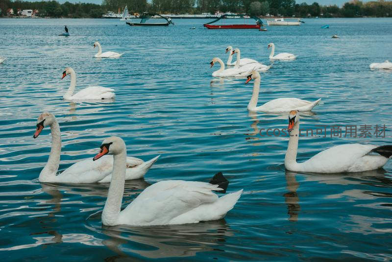 多只天鹅在清澈的湖面上成群结队地游动,它们洁白的身影在碧蓝水面上投下清晰倒影,远处隐约可见帆船和岸边绿树,构成一幅生动的自然生态图景。