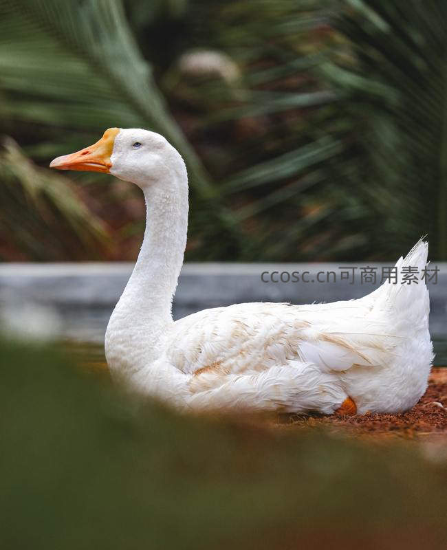 镜头聚焦于一只栖息在泥土地上的白鹅,其洁白蓬松的羽毛与鲜亮橙色的喙形成鲜明对比,背景绿植虚化,凸显主体的细腻质感与宁静神态。