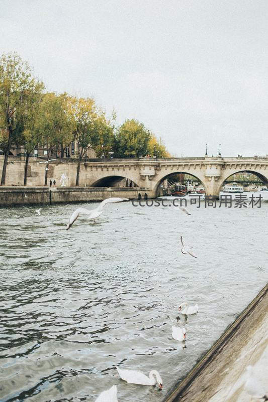 巴黎塞纳河上,古典石桥横跨水面,几只天鹅在波光粼粼的河中嬉戏,远处树叶泛黄,城市与自然和谐共生。