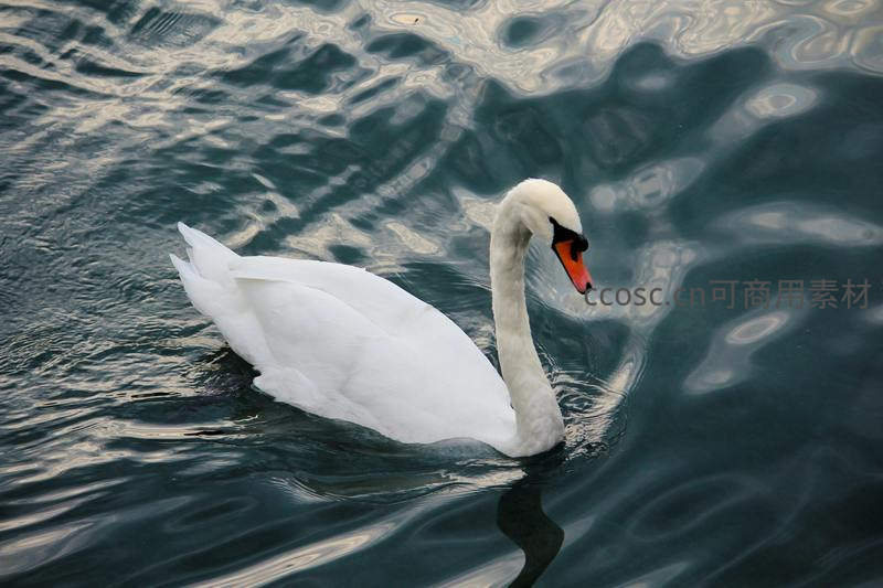 一只白天鹅在深色水面上缓缓滑行,橙红色喙部与洁白羽毛形成鲜明对比,水波荡漾如丝绸,尽显高贵气质。