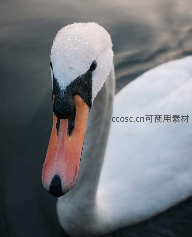 雪花轻落于白天鹅头顶,晶莹剔透,橙黑相间的喙部清晰可见,背景朦胧,营造出冬日静谧而温柔的氛围。