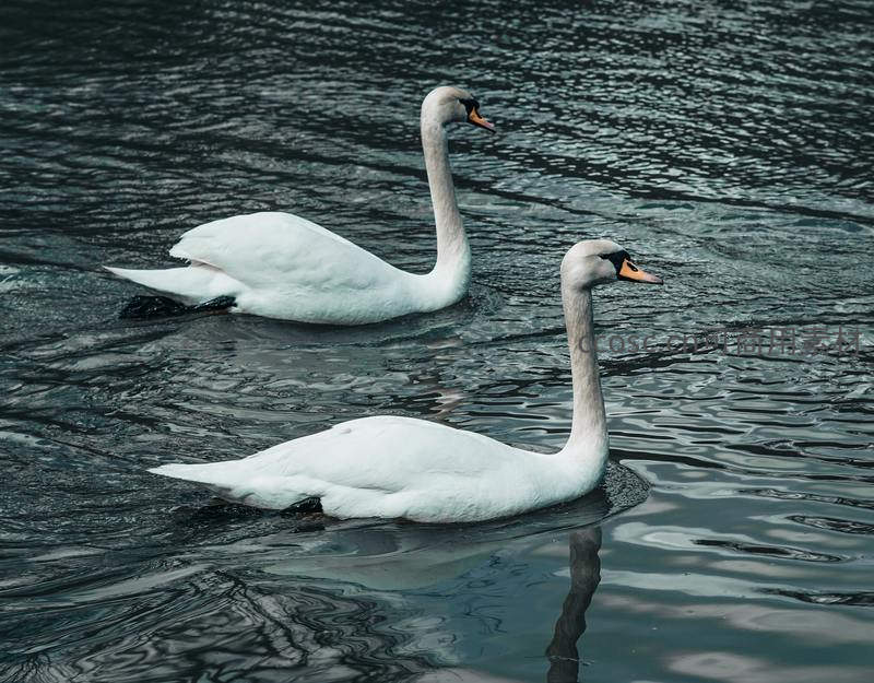 两只洁白的天鹅在微波荡漾的水面上并肩游动,它们修长的脖颈与水中的倒影交相辉映,展现出一种默契与宁静的美感,仿佛一对伴侣。