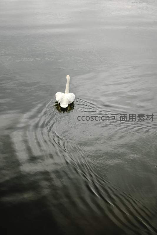 一只洁白的天鹅背对镜头,在平静的水面上游动,身后荡开一圈圈清晰的波纹,营造出一种静谧而略带孤寂的氛围。