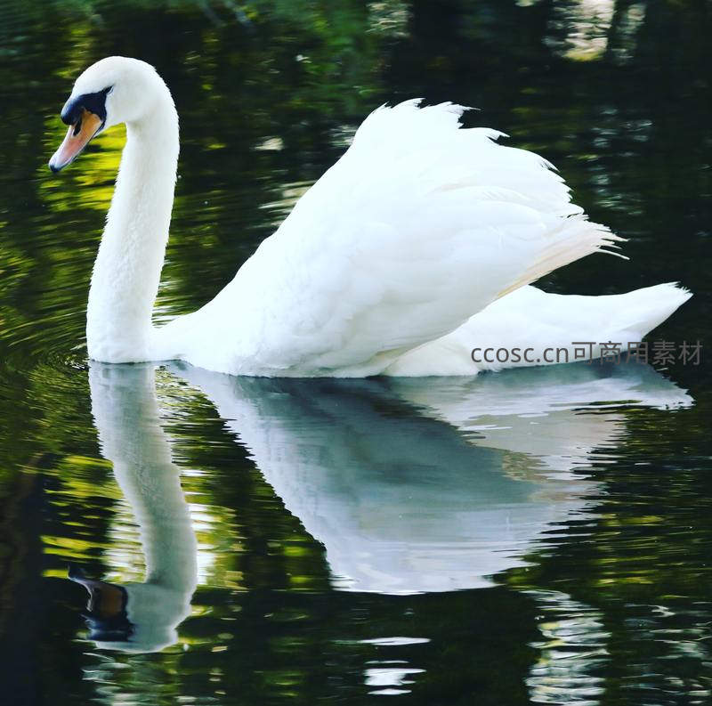 一只姿态优美的白天鹅在碧绿的水面上悠然游弋,其洁白的身影与水面倒影交相辉映,构成一幅和谐宁静的自然画卷。