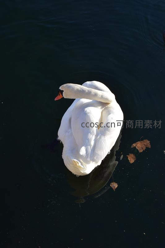 一只洁白的天鹅在深色水面上安静地蜷缩着身体,橙红色的喙与黑色的面部形成鲜明对比,周围漂浮着几片落叶,营造出宁静祥和的氛围。