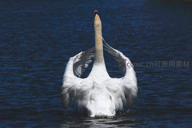 天鹅背对镜头,昂首挺胸于湛蓝水面之上,羽翼微张,阳光洒落,勾勒出洁白羽毛的轮廓,尽显高贵与从容之态。