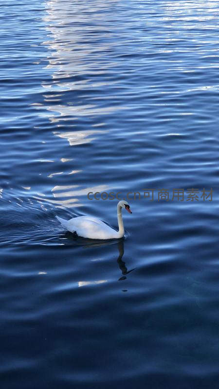 一只洁白的天鹅在深蓝色的水面上悠然游弋,身后留下圈圈涟漪,其优雅身姿与水面倒影相映成趣,尽显自然之美。