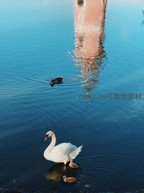 湖面如镜,倒映着远处高塔的粉红轮廓。一只成年天鹅带着两只小天鹅悠然游过,另一只野鸭划破水面,动静结合,意境悠远。