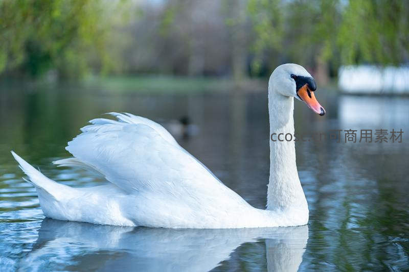 一只白天鹅在湖中昂首挺立,洁白羽毛在阳光下熠熠生辉,水面泛起细微涟漪,尽显高贵与宁静。