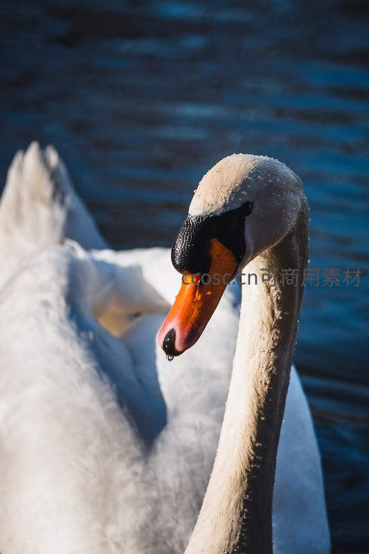 镜头聚焦天鹅头部,清晰捕捉其橙黑相间的喙尖和羽毛纹理,一滴水珠悬垂,彰显自然生命的精致与灵动。