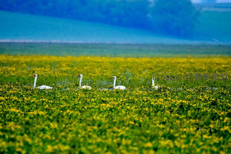 成群天鹅在金黄花海中若隐若现,远处山峦朦胧,色彩斑斓的田野与洁白身影相映成趣,宛如梦幻画卷。
