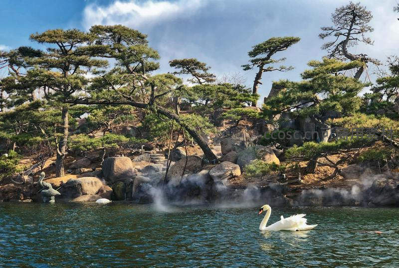 在苍劲古松和嶙峋怪石环绕的湖边,一只天鹅独自漂浮于水面,薄雾缭绕,宛如置身人间仙境。