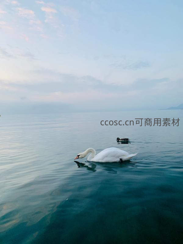 湖面天鹅优雅游弋,水天一色静谧如画