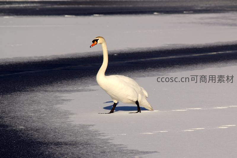 一只洁白的天鹅独自漫步在冰封的湖岸上,雪白的羽毛与灰蓝的冰面相映成趣,展现冬日里生命的坚韧与优雅。