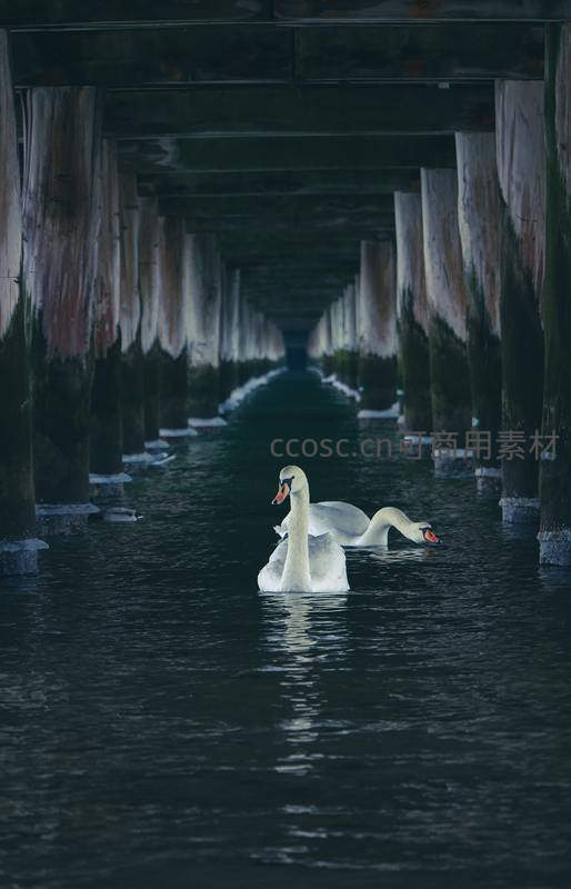 一对天鹅在深色桥墩形成的狭长水道中缓缓前行,水面倒影与结构线条交织,呈现出神秘而富有几何美感的画面。