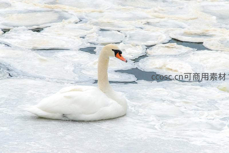 一只天鹅在浮冰覆盖的寒冷河面上从容漂浮,橙色喙部在白色羽翼和灰蓝冰块间格外醒目,展现生命的坚韧与美丽。