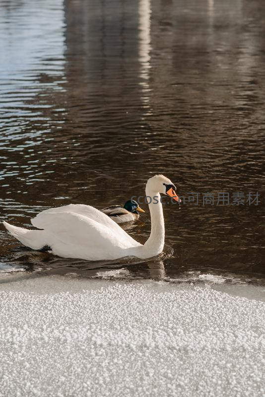 一只高贵的白天鹅在冰冷的湖水中从容划行,身后紧随一只色彩斑斓的绿头鸭。前景是晶莹的冰粒,水面倒映着天空,画面充满冬日生机。