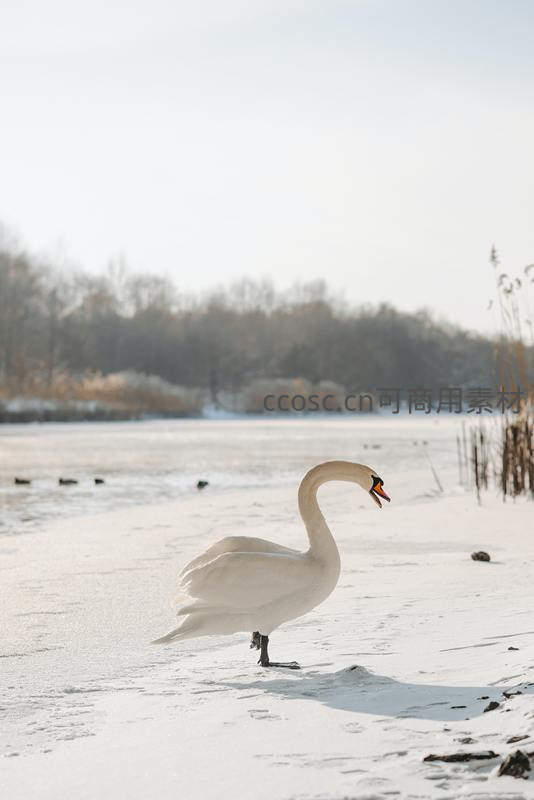 一只洁白的天鹅在被白雪覆盖的湖岸上悠闲踱步,昂首挺胸,姿态高雅。远处是模糊的树林和开阔的冰面,整个场景纯净而富有诗意。