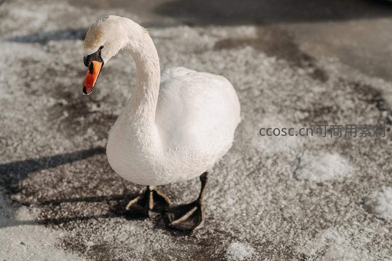 特写镜头下的白天鹅伫立在薄雪覆盖的地面,橙黑相间的喙部清晰可见,羽毛蓬松柔软,脚蹼稳稳踏在雪上,宁静而高贵。