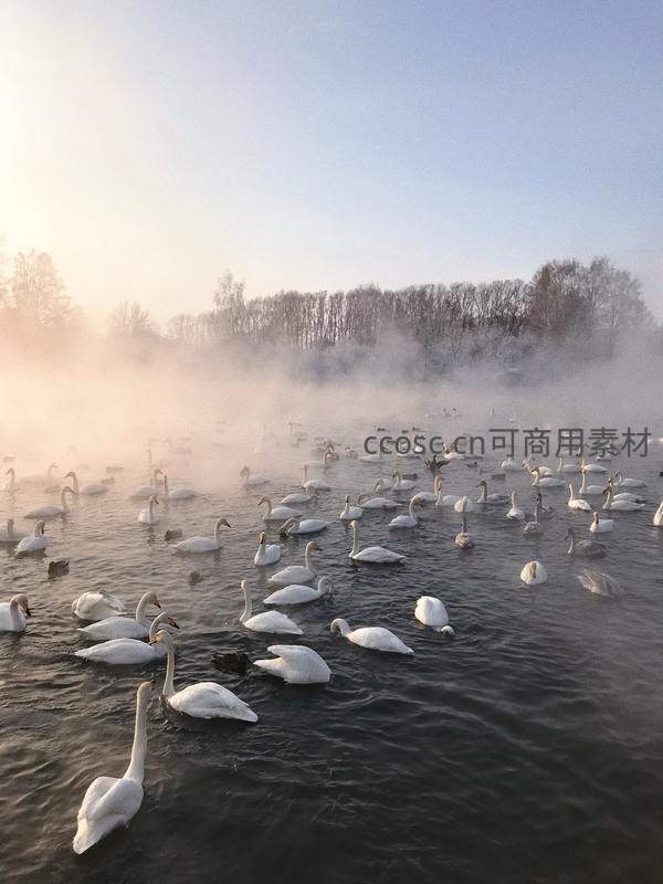 清晨薄雾笼罩着结霜的湖面,数百只天鹅聚集于此,远处树林披上银装,整个场景如仙境般静谧而壮观,充满冬日诗意。