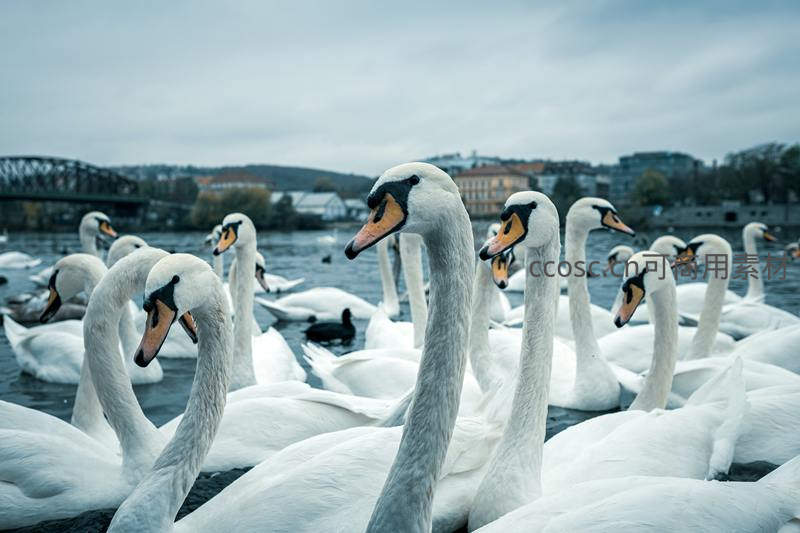 一群天鹅聚集在城市河流中,背景是朦胧的桥梁与建筑,展现人与自然和谐共存的城市滨水生态景观。