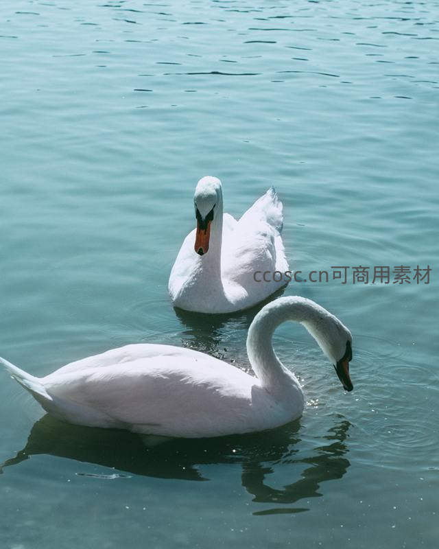 两只洁白的天鹅在清澈碧绿的水面上悠然游动,一只低头觅食,一只昂首挺立,水面倒影清晰,尽显和谐之美。