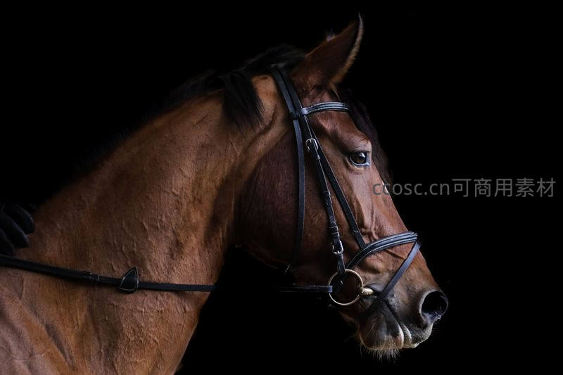深色背景下,一匹棕色马的头部侧面被精准打光,马具细节清晰可见,眼神沉静,整体构图简洁而富有艺术感,突出马匹的高贵气质。