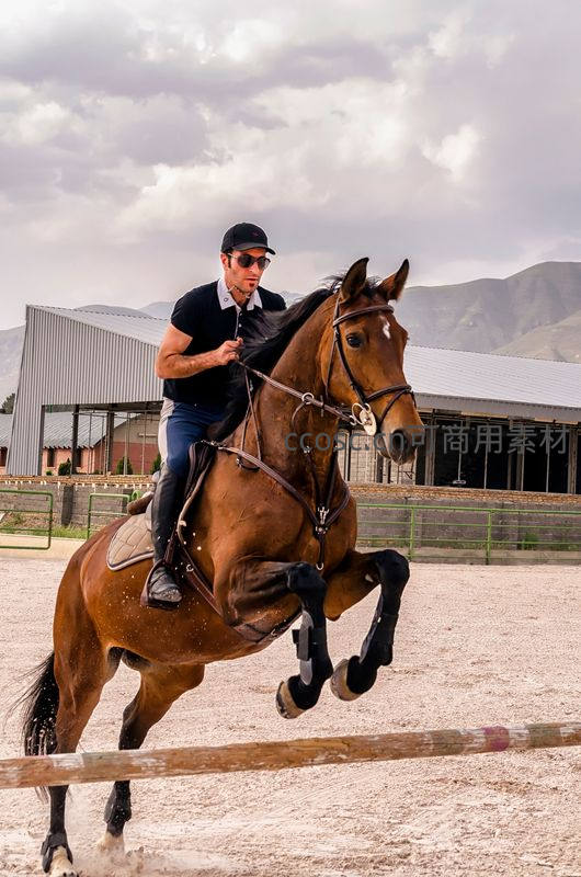 骑手驾驭骏马飞跃障碍瞬间