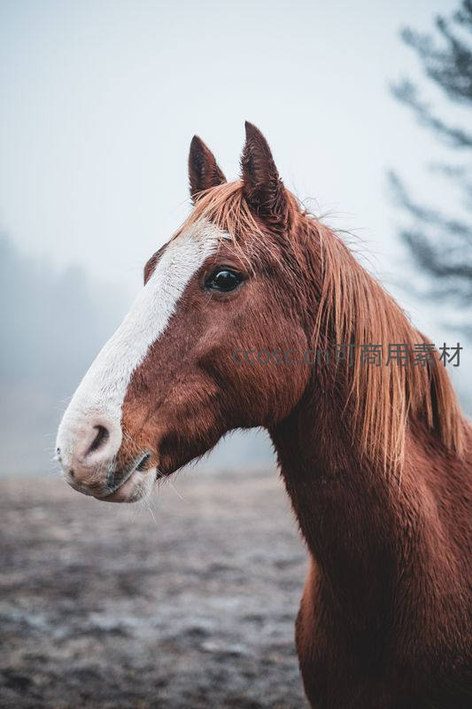 在薄雾弥漫的清晨,一匹棕白相间的马儿侧身而立,湿润的鬃毛随风微动,背景朦胧,宛如一幅古典油画中的诗意场景。