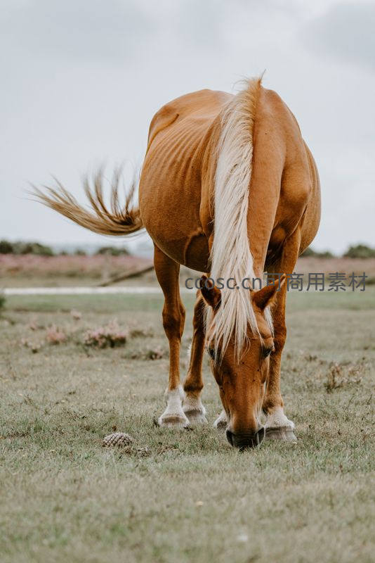 棕马低头吃草,尾巴随风轻扬