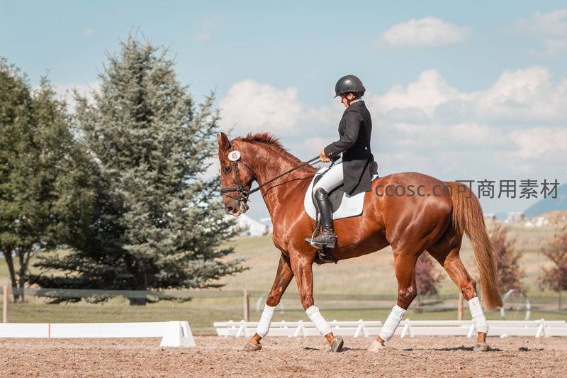 身着正装的骑手驾驭着一匹健硕的棕色马,在阳光明媚的户外赛场上优雅行进,展现了人与马的完美协作。