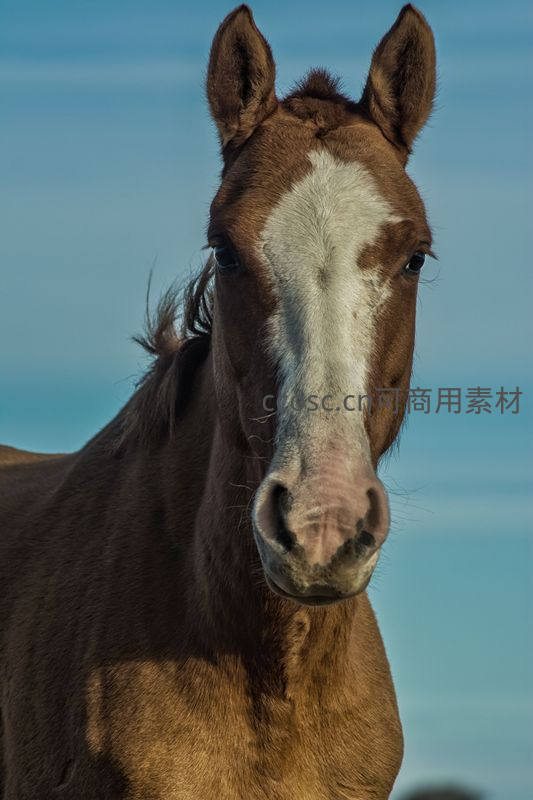 一匹带有白色额斑的棕色马正对镜头,清澈的眼神充满灵性,背景是纯净的蓝色天空,凸显其温顺与美丽。