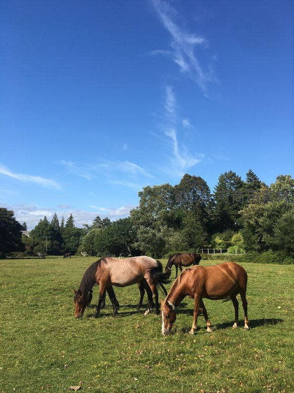 几匹骏马在碧绿草地上低头吃草,头顶是万里无云的蔚蓝天空,营造出宁静祥和的田园牧歌氛围。