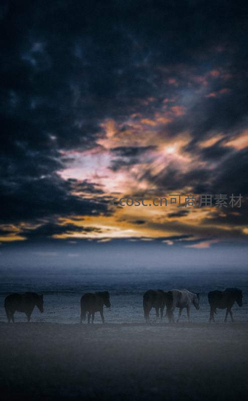 几匹马在暮色笼罩的海滩上静立,背景是色彩斑斓的晚霞与深邃云层,营造出神秘而平和的氛围。